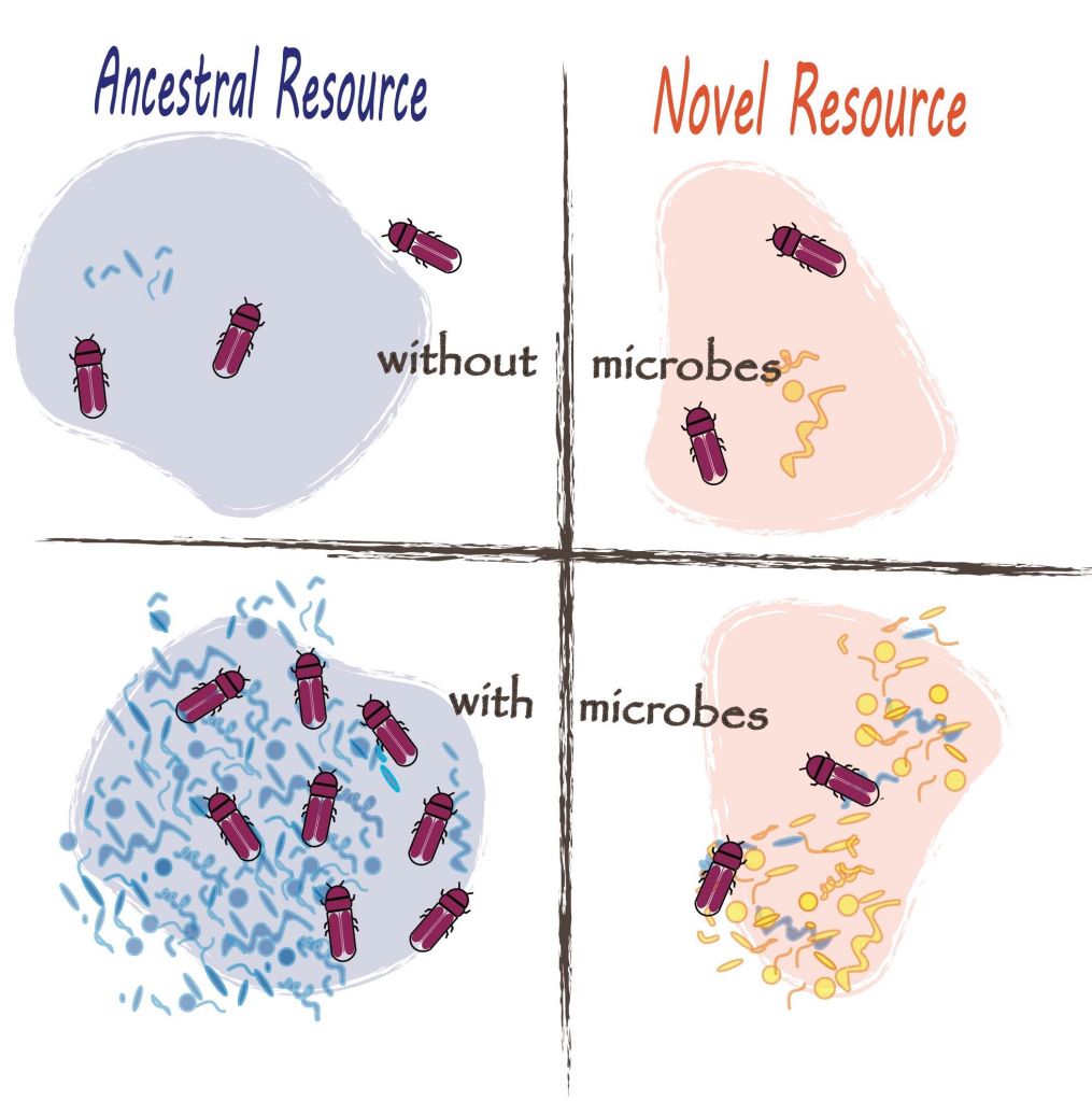 Apart from humans, many organisms acquire beneficial bacterial partners from the food that they eat. But what about generalists, whose diet can vary every day? We asked whether the bacteria in the diet of the red flour beetle – a grain pest found across the world – impact the beetles’ fitness in different diets. For these beetles, flour is not only their diet, but also the environment in which they live. Aparna found that beetles derive many fitness benefits from microbes in wheat flour, which they have used for many generations. But microbes from the new diets are not important for beetle fitness. So, diet shifts can be problematic for generalists, because their bacterial partners may be missing. Read the paper here.