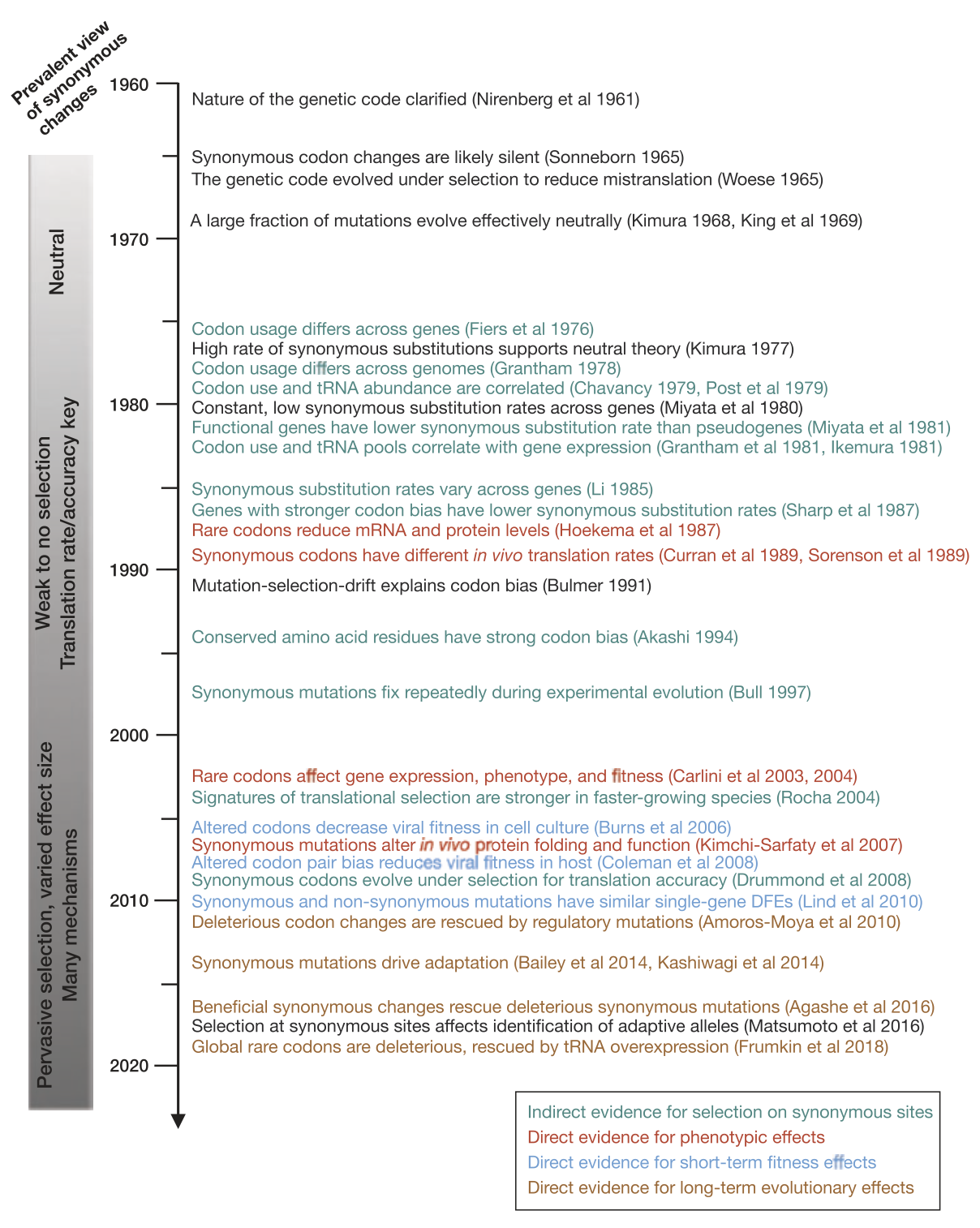 Synonymous variation was long thought to be neutral (invisible to selection), but in the 50 years since we first began understanding the genetic code, this view has undergone a dramatic shift. A new book on the impact of synonymous mutations (Single Nucleotide Polymorphisms: Human variation and a coming revolution in biology and medicine) includes our chapter outlining the arc of this change in evolutionary thinking about synonymous mutations. Writing this was a lot of fun, and involved a deep dive into papers from the heady days of the discovery of DNA and the genetic code. Other chapters in the book also synthesize an impressive amount of information on the mechanisms driving the effects of synonymous variation, and the role it plays in disease. Hopefully the coming decades will involve increased efforts to understand synonymous variation!