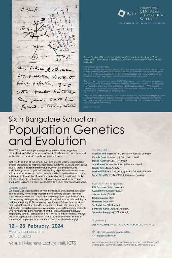 Happy to announce that applications are now open for the next Bangalore school on population genetics and evolution from 12–23 Feb, 2024. We welcome PhD students and postdocs interested in evolutionary biology, from India as well as other Asian and African countries. There are no participation fees, and we have some travel support for international participants. More information is available here; apply by 30 Oct 2023.