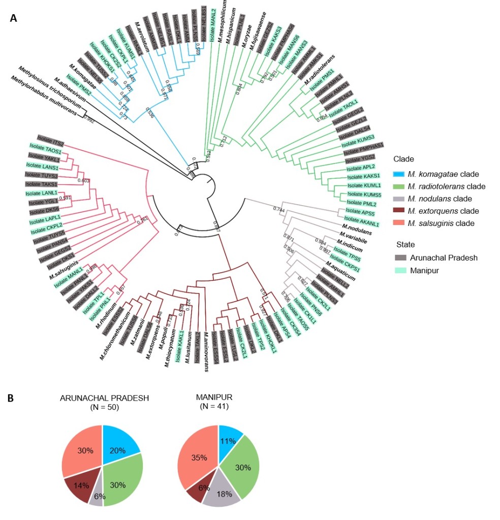 We are testing the impact of host association on Methylobacterium species isolated from the leaves of traditionally cultivated rice landraces from North-Eastern India. Previously published work suggests that some species from this genus (e.g. M. oryzae and M. phyllospherae) use methanol emitted by rice leaves as a primary carbon source, and may produce growth hormones that enhance host growth. We found that phenotypic diversity in Methylobacterium is associated strongly with the host landrace identity, rather than other factors (Sanjenbam et al 2020). We are now testing whether the genetically distinct rice varieties in northeastern India have co-evolved specific associations with their local Methylobacterium partners. If we find specific associations between local rice and associated Methylobacterium species, we aim to characterize the chemical and genetic basis of the association. This work is conducted in collaboration with P. V. Shivaprasad and Radhika Venkatesan at NCBS.